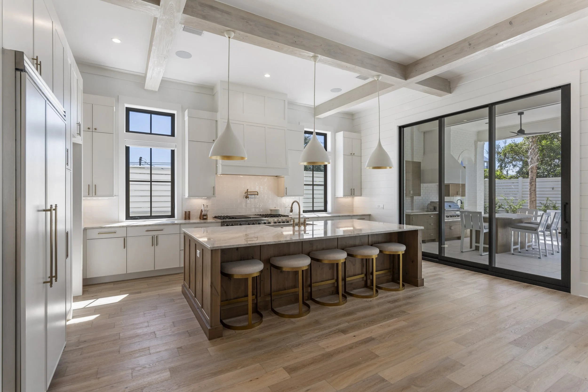 This chef-inspired kitchen is the heart of the home, seamlessly blending elegance and functionality. Featuring a spacious quartz island with seating for five, custom cabinetry, and top-of-the-line stainless steel appliances, it’s designed to impress. Statement pendant lighting and exposed wood beams add warmth and character, while the sleek pot filler over the gas range and ample counter space make cooking effortless. Oversized sliding glass doors open directly to the outdoor kitchen and dining area, creating the perfect flow for entertaining indoors and out.